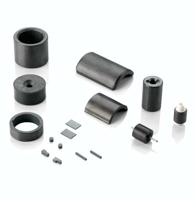 铁氧体是应用最广泛的的一种永磁材料,以粉末冶金法制造,主要分为钡料(Ba)和锶料(Sr)两种,并分为各向异性和各向同性两类,是不易退磁不易腐蚀的一种永磁材料,最高工作温度可达250摄氏度,较坚硬且脆,可用金刚石沙等工具切割加工,用合金刚加工之模具一次成型。此类产品大量应用于永磁电机(Motor)和扬声器(Speaker)等领域。