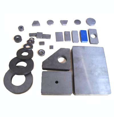 铁氧体是应用最广泛的的一种永磁材料,以粉末冶金法制造,主要分为钡料(Ba)和锶料(Sr)两种,并分为各向异性和各向同性两类,是不易退磁不易腐蚀的一种永磁材料,最高工作温度可达250摄氏度,较坚硬且脆,可用金刚石沙等工具切割加工,用合金刚加工之模具一次成型。此类产品大量应用于永磁电机(Motor)和扬声器(Speaker)等领域。