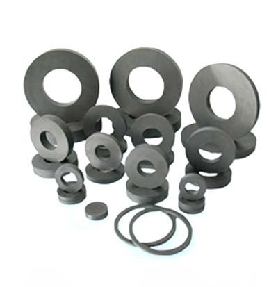铁氧体是应用最广泛的的一种永磁材料,以粉末冶金法制造,主要分为钡料(Ba)和锶料(Sr)两种,并分为各向异性和各向同性两类,是不易退磁不易腐蚀的一种永磁材料,最高工作温度可达250摄氏度,较坚硬且脆,可用金刚石沙等工具切割加工,用合金刚加工之模具一次成型。此类产品大量应用于永磁电机(Motor)和扬声器(Speaker)等领域。